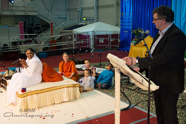 On the 31st evening, welcoming Amma to the country, Mr. Thomas Pringle, Member of Parliament of the Government of Ireland, thanked Amma for the support and encouragement she has given her Irish supporters to keep the Irish culture and language alive and celebrate that culture. He added, “Amma has directly touched the lives of 33 million people around the world, passing on a message of love, respect and positive energy to each and every one of those people. If each of those 33 million people could pass on the same message in their daily lives, just by doing the simple things, making time for each other, and sharing compassion, I think we could effect a real change in the world.” Mr. Pringle also said, “I think I speak for everyone here tonight when I say, Amma, we know you are extremely busy, but please find time to visit Ireland every year from now on.”
