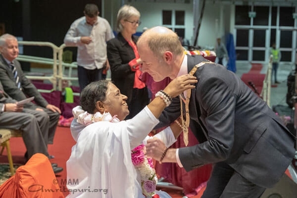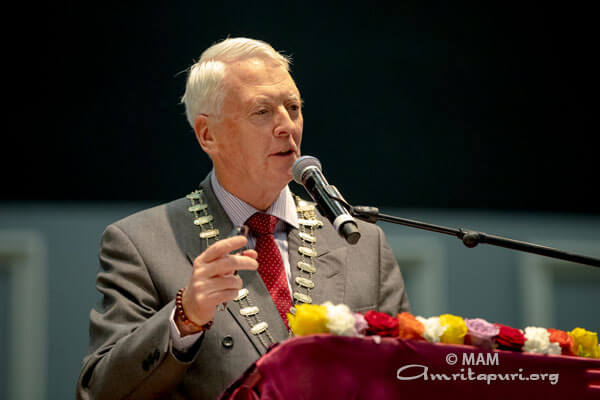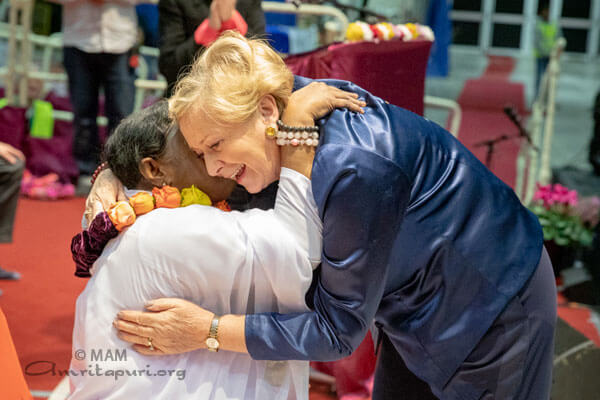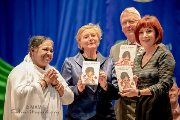 Ms Madigan spoke about the universality of Amma’s teachings: “Throughout Amma’s life, her focus has been on uplifting the poor and easing the plight of those who are suffering. No matter what your religious beliefs are, or whether you have none at all, these aspirations are the very basic threads of humanity. Oscar Romero once said, ‘Aspire not to have more, but to be more,’ and I think Amma, you embody this.”